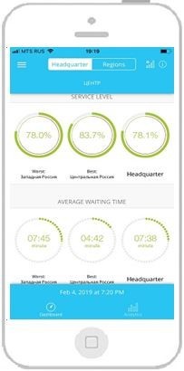 Руководство организации для обеспечения необходимого управления и контроля должно иметь под рукой удобный и функциональный инструмент мониторинга. Но при этом не всегда удобно использовать решения для мониторинга Q-Systems, реализованные в формате веб-приложений, например, в случае, когда нет доступа к компьютеру. В такой ситуации на помощь приходит продукт Q-Board. Он представляет собой мобильное приложение, авторизовавшись в котором клиент получает доступ к набору показателей и статистических данных. Набор данных соответствует настроенным правам доступа учетной записи. Например, обзор основных показателей состояния очереди в отделении, нескольких отделениях, либо по макрорегионам (конкретный формат отображения настраивается в зависимости от требуемых прав доступа, запросов и пожеланий клиента). Также данное приложение позволяет увидеть не только текущие данные, но и краткую статистическую информацию за определенный период (за неделю, месяц, квартал и т.д.), что позволяет не только увидеть текущую ситуацию, но и сразу же провести краткий предварительный анализ, если это необходимо.